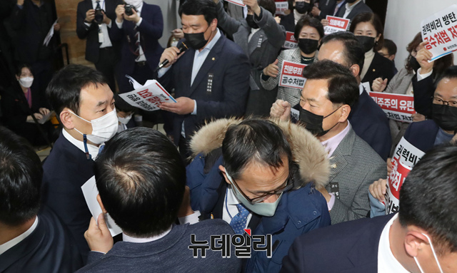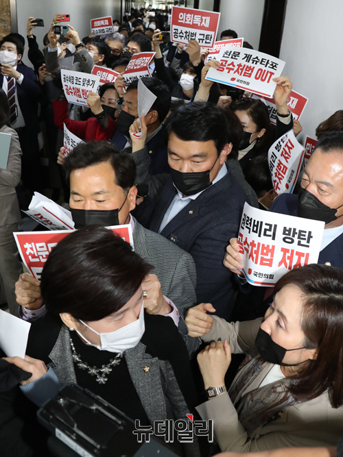 더불어민주당 법안심사 소위 소속 의원들이 7일 오후 국회 법사위 법안심사제1소위 회의실 앞에서 공수처법 개정안에 반대하며 구호를 외치고 있는 국민의힘 의원들을 지나 회의장으로 들어서고 있다. (사진=공동취재단)