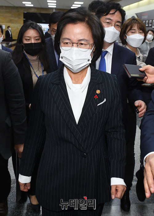 추미애 법무부 장관이 8일 오전 국회에서 열린 법제사법위원회 전체회의에서 공수처법 개정안이 통과된 뒤 대기장소로 이동하고 있다. (사진=공동취재단)