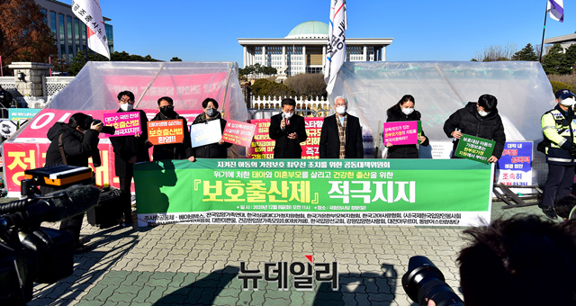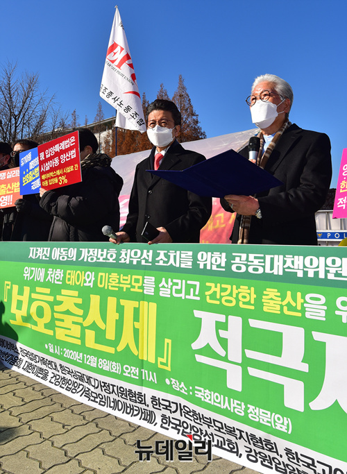 베이비박스를 운영하는 주사랑공동체 이종락 목사와 공동대책위원회 회원들이 8일 오전 서울 여의도 국회의사당 정문 앞에서 '보호출산제(보호출산에 관한 특별법안)'를 지지하는 기자회견을 갖고 있다.