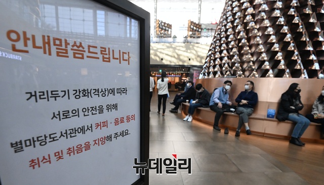 사회적 거리두기 강화로 카페, 제과점 등 매장내 영업이 금지되자 코엑스 별마당도서관 내 좌석들은 식음료를 포장해서 먹는 사람들로 채워졌다. 거리두기 대책의 허점으로 '풍선 효과'가 나타나자 정부도 앞으로 추가 대책을 마련한다고 밝혔다.