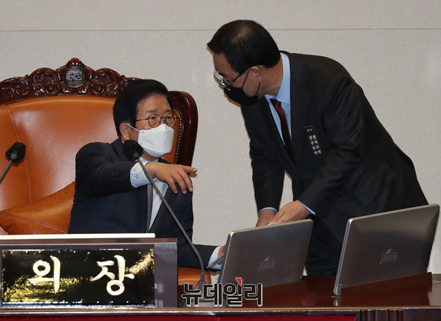 박병석 국회의장이 9일 오후 국회에서 열린 본회의에서 주호영 국민의힘 원내대표와 대화하고 있다. (사진=공동취재단)