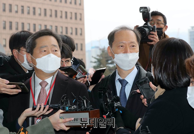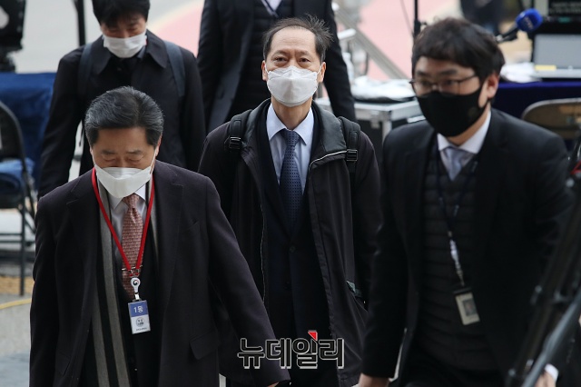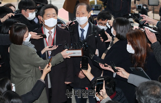 윤석열 검찰총장 징계위원회가 열리는 10일 오전 윤 총장 측 법률 대리인 이석웅(왼쪽), 이완규 변호사가 경기 과천시 정부과천청사로 들어가고 있다.