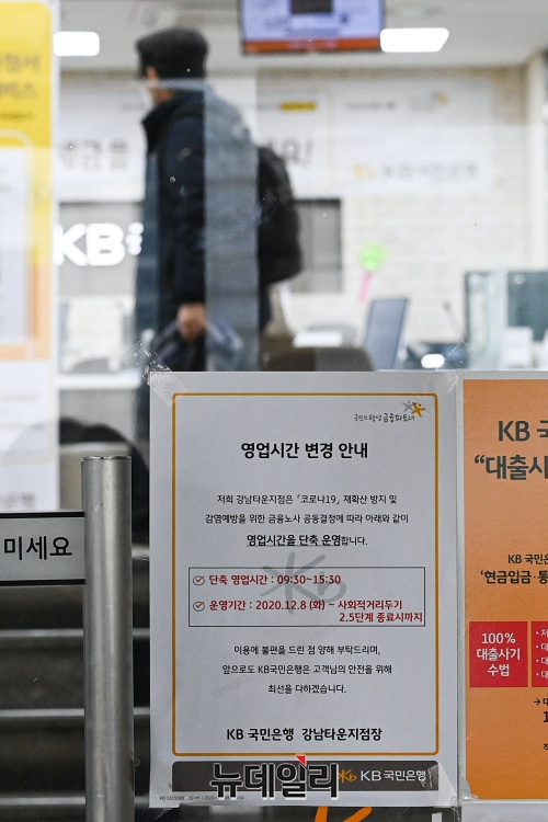 사회적 거리두기 2.5단계가 시행중이 10일 오후 서울 서초구의 한 저축은행에 영업시간 단축 안내문이 붙어있다. 저축은행중앙회는 거리두기 2.5단계 격상에 따라 10일부터 28일까지 수도권 소재 저축은행 영업시간을 단축운영한다고 밝혔다.