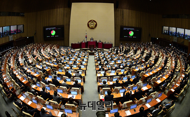 고위공직자범죄수사처 설치 및 운영에 관한 법률 일부개정법률안(공수처법)이 10일 오후 국회에서 열린 본회의에서 찬성 187인 반대 99인 기권 1인으로 가결되고 있다. (사진=공동취재단)