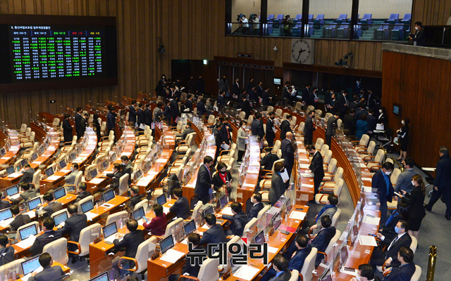 국민의힘 의원들이 10일 국회에서 열린 본회의에서 고위공직자범죄수사처 설치 및 운영에 관한 법률 일부개정법률안(공수처법)이 가결되자 본회의장을 떠나고 있다. (사진=공동취재단)