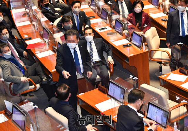 정청래 더불어민주당 의원이 10일 오후 국회에서 열린 본회의에서 회의 입장 중 국민의힘 소속 의원이 욕설을 했다며 주호영 국민의힘 원내대표를 찾아가 항의하고 있다. (사진=공동취재단)