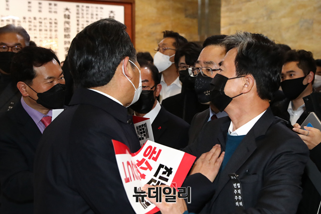 정청래 더불어민주당 의원이 10일 오후 국회에서 열린 본회의에서 회의 입장 중 국민의힘 소속 의원이 욕설을 했다며 주호영 국민의힘 원내대표를 찾아가 항의하고 있다. (사진=공동취재단)
