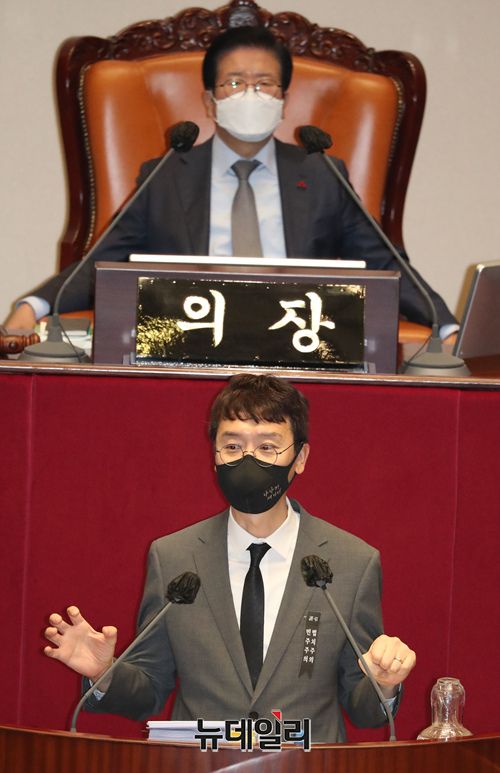 김웅 국민의힘 의원이 11일 오전 국회에서 열린 본회의에서 국정원법 개정안에 대한 무제한 토론(필리버스터)을 하고 있다. (사진=공동취재단)