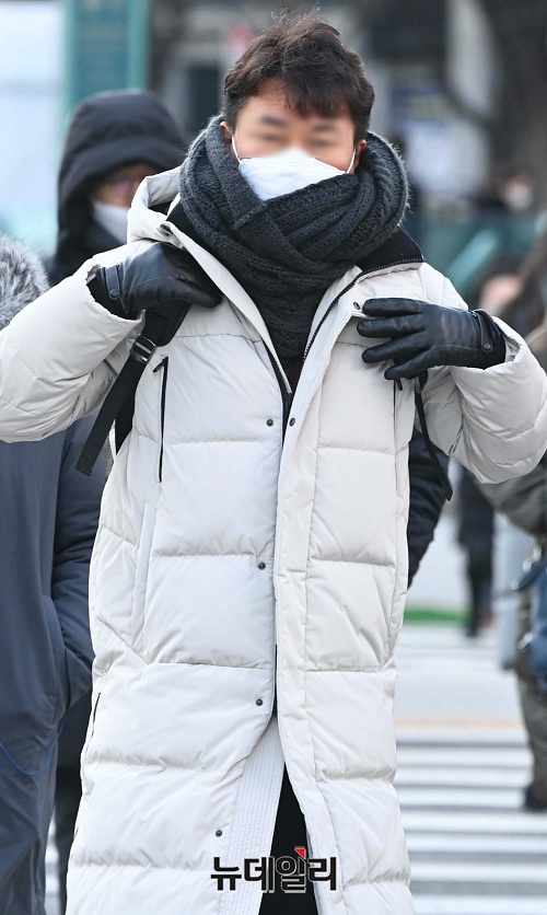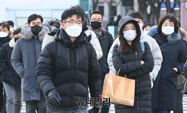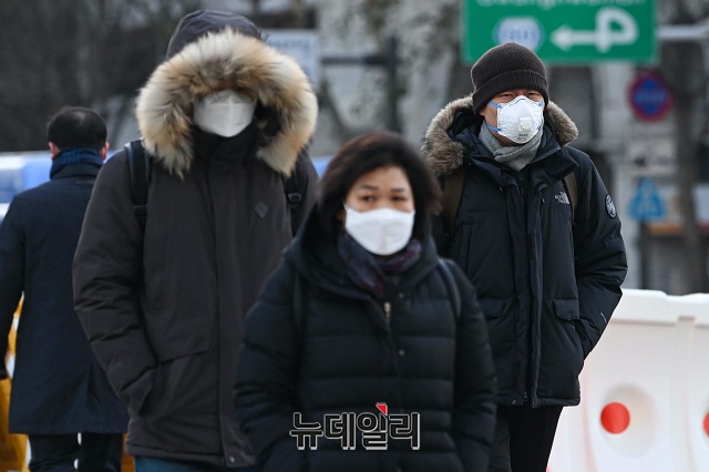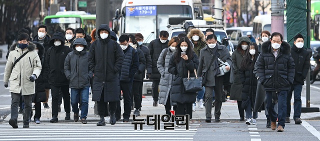 서울을 비롯한 중부지방에 한파주의보가 내려진 14일 오전 서울 종로구 광화문역 인근에서 직장인들이 롱패딩을 입고 출근하고 있다.