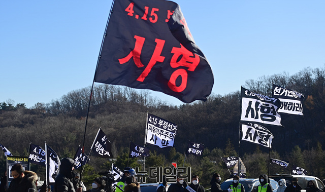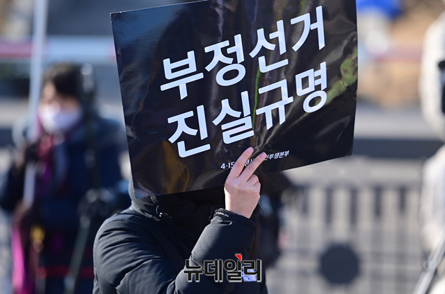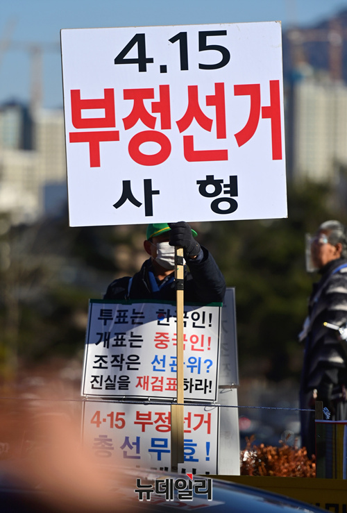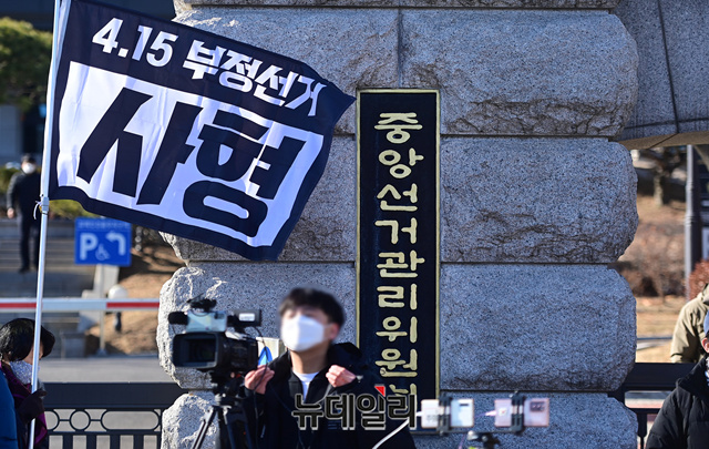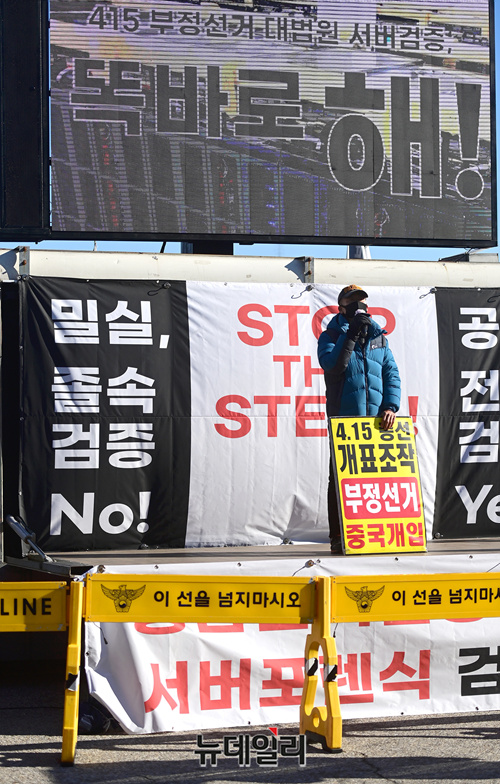 415부정선거국민투쟁본부를 비롯한 시민단체가 14일 오후 경기 과천시 중앙선거관리위원회 앞에서 중앙선관위 서버와 투표지 분류기 등의 현장 검증을 앞두고 진실규명을 촉구하고 있다.