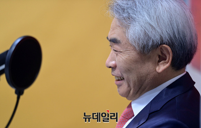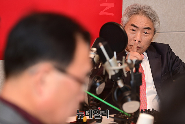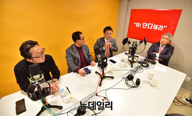 내년 부산시장 보궐선거에 출사표를 던진 정규재 펜앤드마이크 대표가 8일 오후 서울 서초구의 한 스튜디오에서 뉴데일리 주최로 열린 '부산시장 출마예상자 토론회'에서 발언하고 있다.