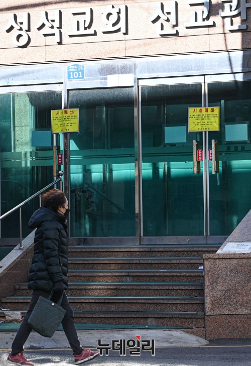'코로나19(중국 우한 폐렴)' 집단감염이 발생한 서울 강서구 성석교회에 15일 오후 시설폐쇄 안내문이 붙어있다.