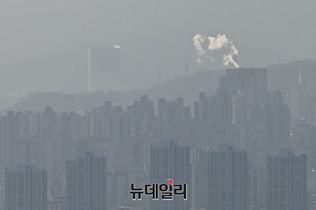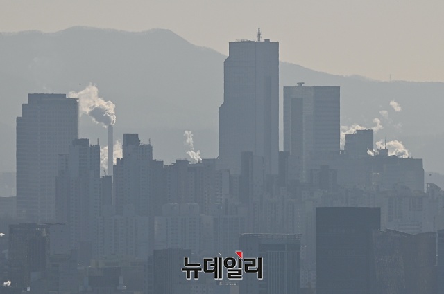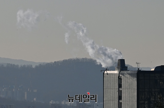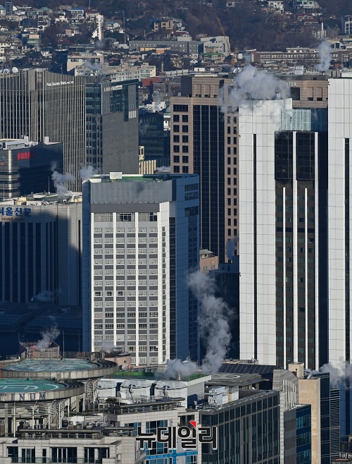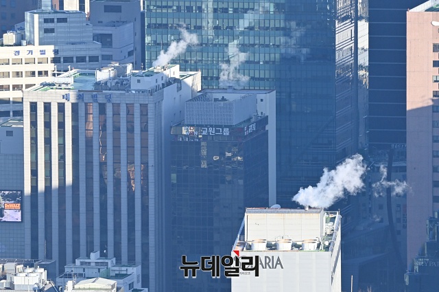 서울을 비롯한 중부지방에 한파주의보가 내려진 16일 오전 서울 용산구 남산타워에서 바라본 도심 건물에서 수증기가 뿜어져 나오고 있다.