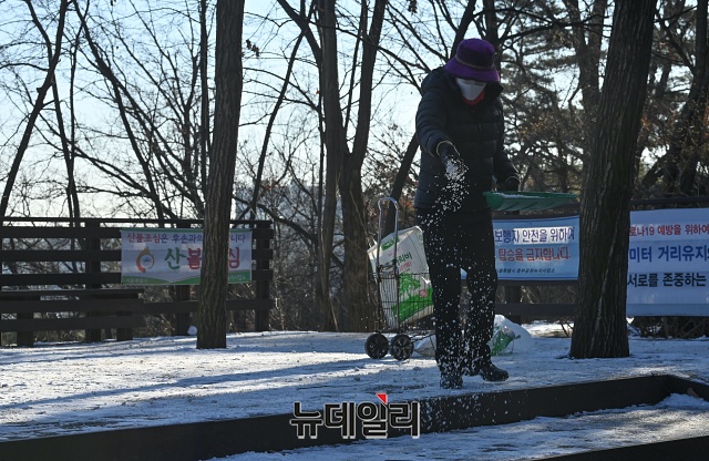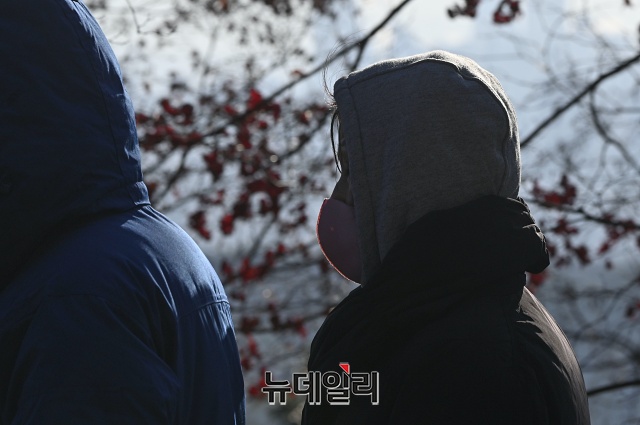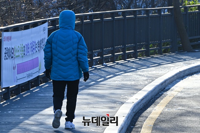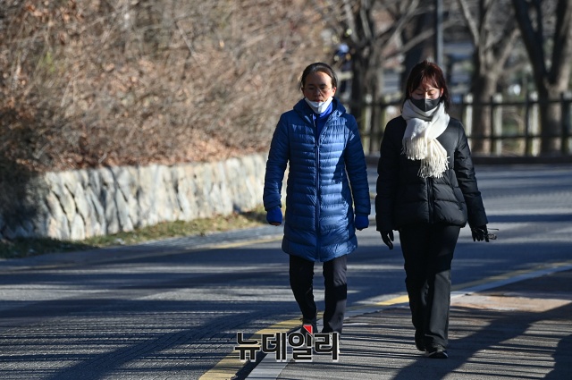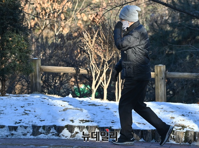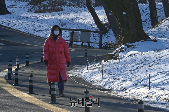 서울을 비롯한 중부지방에 한파주의보가 내려진 16일 오전 서울 용산구 남산 둘레길에서 시민들이 패딩차림으로 산책을 하고 있다.
