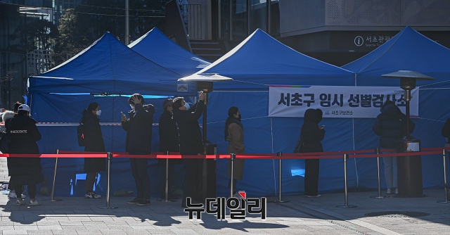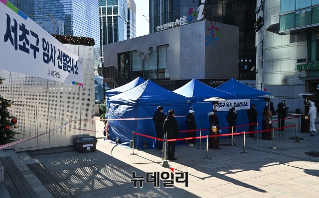 '코로나19(중국 우한 폐렴)' 신규 확진자가 1,078명 발생한 16일 오후 서울 서초구 강남역 인근에 마련된 임시 선별진료소에서 시민들이 검사를 받기위해 줄을 서 있다. 신규 확진자는 사흘만에 1,000명 대를 기록했다.