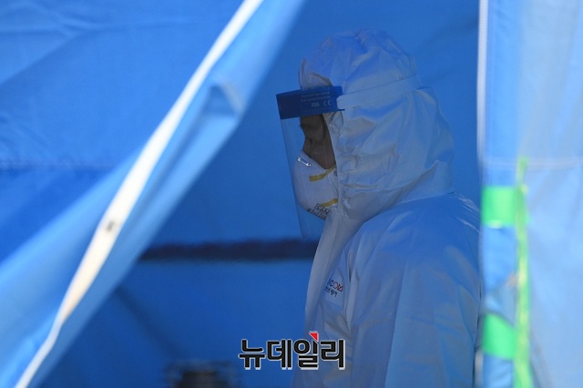 '코로나19(중국 우한 폐렴)' 신규 확진자가 1,078명 발생한 16일 오후 서울 서초구 강남역 인근에 마련된 임시 선별진료소에서 의료진이 방한용품을 착용하고 업무를 보고 있다. 신규 확진자는 사흘만에 1,000명 대를 기록했다.