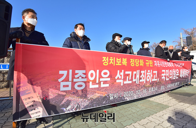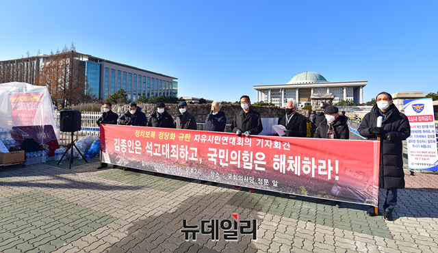 자유시민연대회의 회원들이 16일 오후 국회 정문 앞에서 김종인 국민의힘 비상대책위원장의 전직 대통령 관련 대국민사과와 관련해 기자회견을 열고 "보수의 화해와 단결을 부르짖어야 할 때에 반목과 분열을 조장했다"며 "김종인 비대위원장을 추대하고 배신정치, 뺄셈정치, 수구좌파 2중대 정치를 제대로 비판 못하는 국민의힘은 당장 해체하라"고 주장했다.