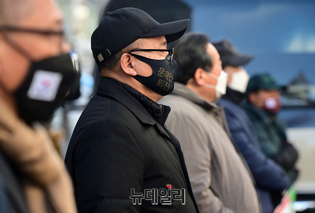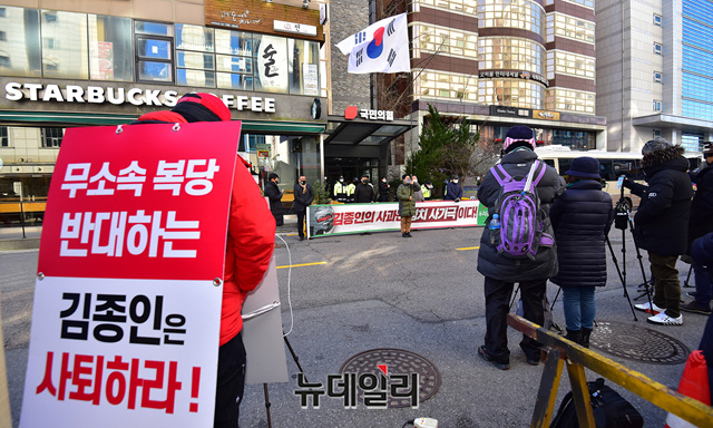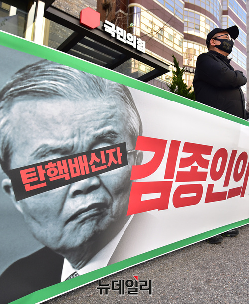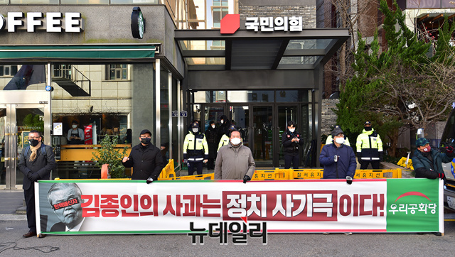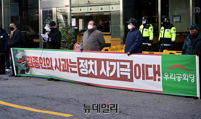 우리공화당이 17일 오후 서울 여의도 국민의힘 당사 앞에서 김종인 비대위원장의 대국민사과를 규탄하는 기자회견을 갖고 있다. 이들은 "김종인의 사과는 정치 사기극이다"며 "자기의 정치적 욕심만 있다"고 주장했다.