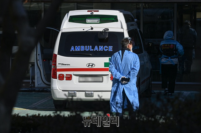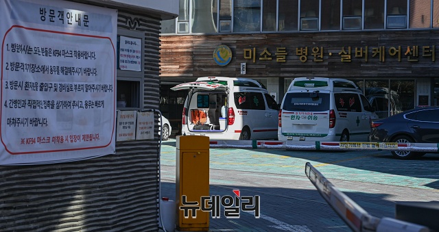 '코로나19(중국 우한 폐렴)' 집단감염이 발생한 서울 구로구 미소들요양병원에 17일 오전 구급차가 세워져있다.