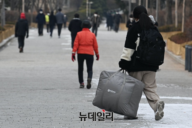 서울시립대 학생이 18일 오전 서울 동대문구 서울시립대 기숙사에서 짐을 챙겨 나오고 있다.서울시는 코로나19 확진자를 대비하기 위해 교회 수양관, 방학을 앞둔 대학교 기숙사 등을 활용해 생활치료센터로 활용한다고 밝혔다. 시립대 기숙사 내 520개 병상을 확보하고, 서울 소재 8개 대학과도 협의를 진행 중이다.시립대 학생은 "코로나19가 폭증하는 상황에 어쩔수 없지만 갑자기 빼라고 하니 당황스럽다"라며 "지방이 본가인 학생들은 방학동안 서울에 있고 싶어도 있을곳이 없다"고 말했다.