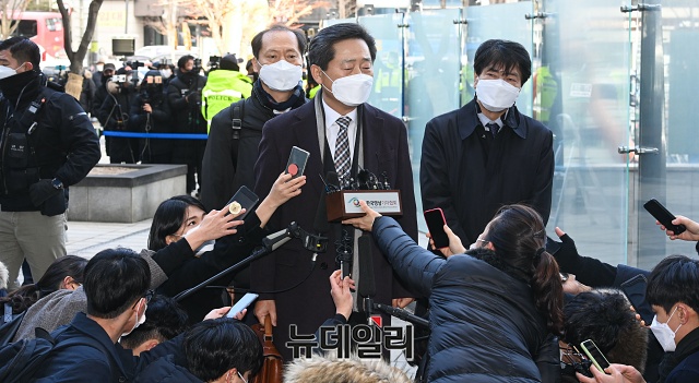 윤석열 검찰총장에 대한 정직 집행정지 2차 심문이 열린 24일 오후 윤 총장 측 법률대리인 이석웅, 이완규, 손경식 변호사가 서울 서초구 서울행정법원에서 취재진의 질문에 답하고 있다.재판부는 22일 1차 심문을 진행했지만 결론을 내리지 못했다. 법원이 윤 총장의 집행정지 신청을 인용하면 본안 판결까지 직무집행정지 처분효력은 정지되고, 윤 총장은 업무에 복귀한다. 기각 결정이 나오면 윤 총장은 본안소송 결과가 나올 때까지 정직 처분이 유지된다.