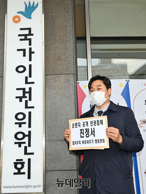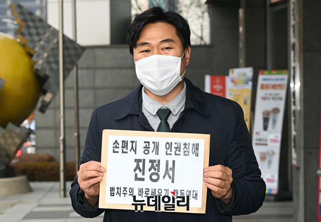 이종배 법치주의바로세우기행동연대 대표가 28일 오전 서울 중구 국가인권위원회 앞에서 '박원순 피해자 편지 공개 인권위 진정 기자회견'을 갖고 있다.