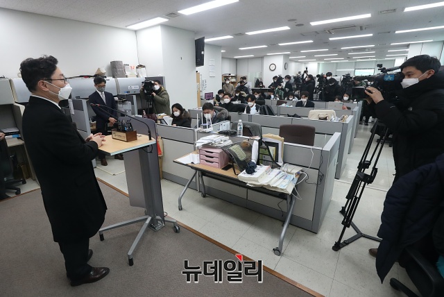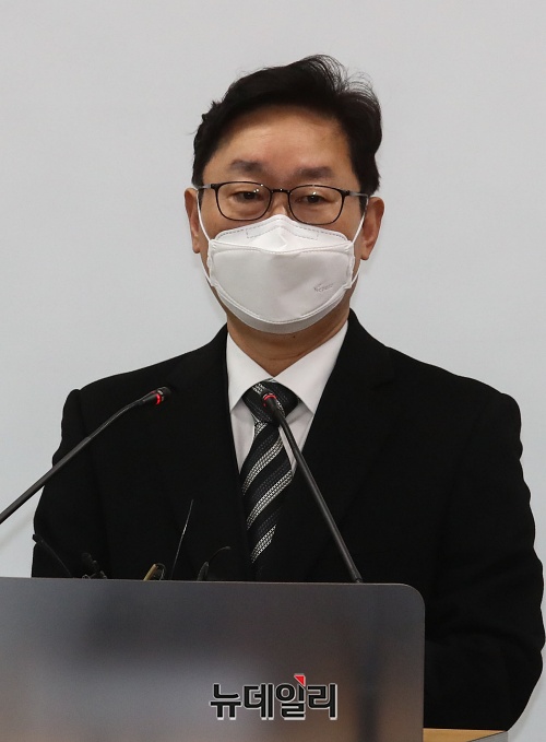 박범계 법무부장관 후보자가 4일 오후 서울 서초구 서울고등검찰청 기자실에서 취재진의 질문에 답하고 있다.