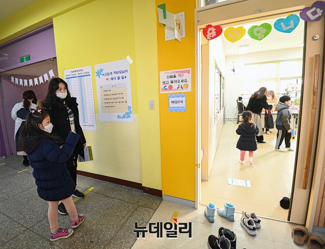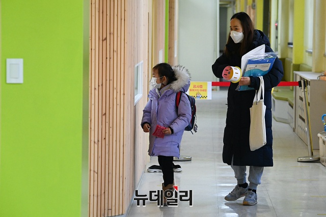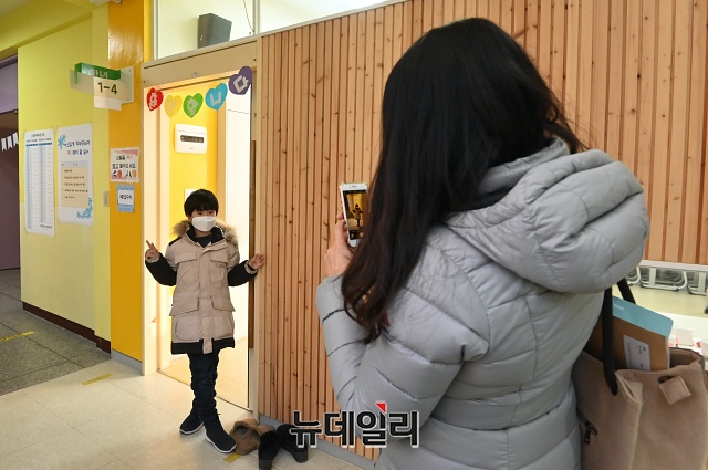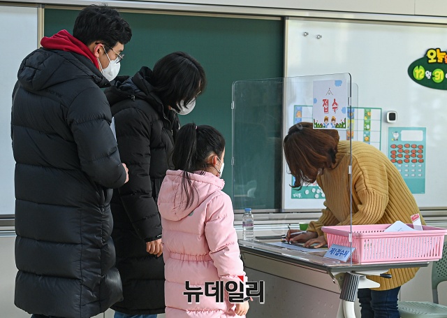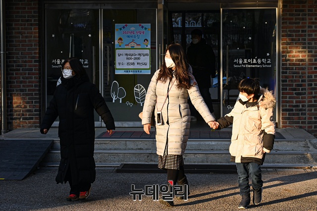 2021학년도 서울 초등학교 예비소집일인 6일 오후 서울 강남구 포이초등학교에서 어린이와 학부모가 예비소집을 위해 이동하고 있다.초등학교 예비소집은 아동과 보호자가 직접 방문이 원칙이지만, 코로나19로 인해 학교 상황에 맞춰 온라인 예비소집이나 화상통화 등 비대면 방식도 허용된다.이번 예비소집은 맞벌이 부부 등의 참여를 위해 6일, 7일 이틀간 오후 4시부터 오후 8시까지 진행된다.