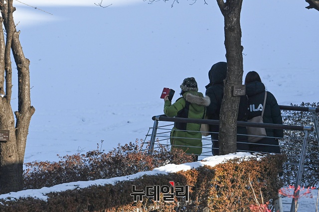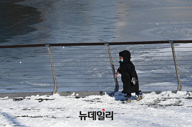 주말에도 한파가 이어지는 9일 오후 서울 송파구 석촌호수가 얼어 눈이 쌓여있다. 기상청은 12일까지 전국 대부분 지역에 한파가 이어질 것으로 예보했다.