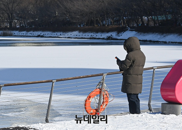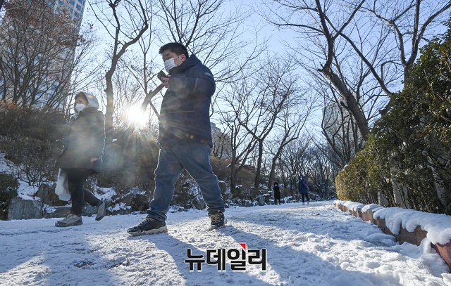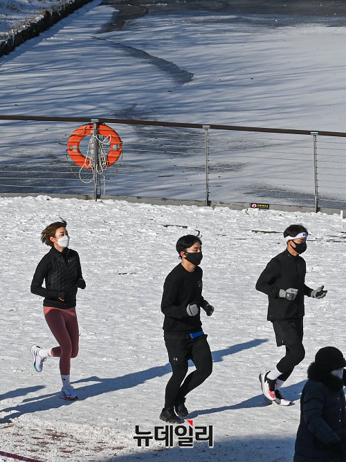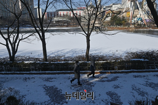 주말에도 한파가 이어지는 9일 오후 서울 송파구 석촌호수에서 시민들이 운동을 하고 있다. 기상청은 다음주 중반까지 전국 대부분 지역에 한파가 이어질 것으로 예보했다.