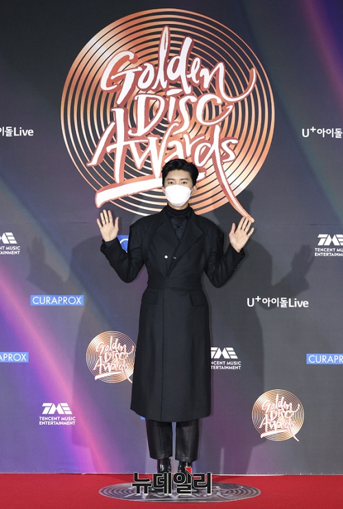 가수 임영웅이 9일 오후 경기 고양시 킨텍스에서 비대면으로 진행된 '제 35회 골든디스크 어워즈'에서 포토타임을 갖고 있다.