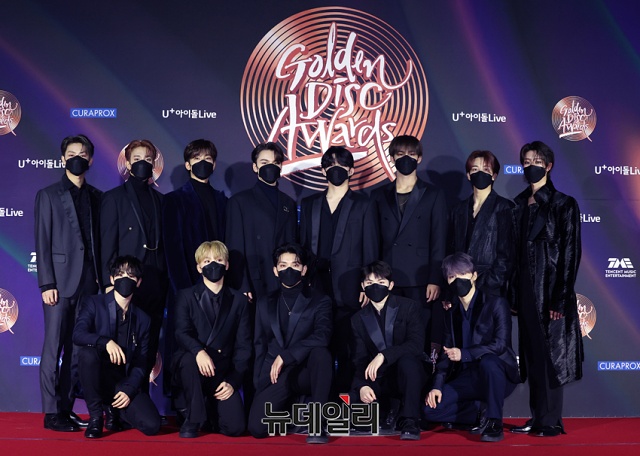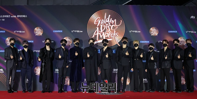 아이돌그룹 세븐틴이 10일 오후 경기 고양시 킨텍스에서 비대면으로 진행된 '제 35회 골든디스크 어워즈'에서 포토타임을 갖고 있다.