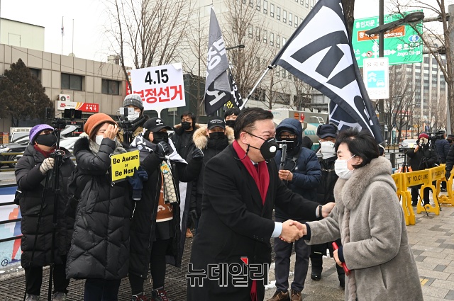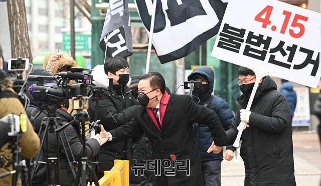 민경욱 415부정선거국민투쟁본부 (국투본) 대표가 11일 오전 서울 종로구 종로경찰서 앞에서 소환조사 전 지지자들과 악수를 하고 있다.