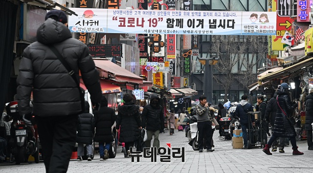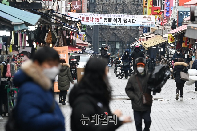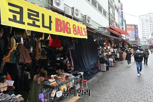 3차 재난지원금 지급이 시작되는 11일 오전 서울 중구 남대문시장에 코로나19 극복 기원 현수막이 걸려있다.