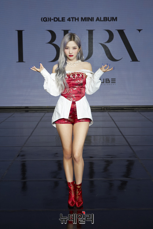 걸그룹 (여자)아이들 소연이 11일 오후 온라인으로 진행된 4번째 미니앨범 'I burn(아이 번)' 쇼케이스에서 포토타임을 갖고 있다.이번 앨범은 '이별은 완전히 잊혀질 때까지 끝난 것이 아니다'는 생각에서 시작됐다. 이별 후 행복을 되찾기 전까지의 과정 속에서 느껴지는 여러 가지 감정들을 담아냈다.타이틀 곡 '화(火花)'는 타오르는 불과 화려한 꽃을 메타포로 사랑의 아픔을 노래한 곡이다. 리더 소연과 작곡가 Pop Time이 공동으로 작업해 중독성 있는 훅과 극적인 감정 변화를 담은 노랫말이 인상적이다. (사진=큐브엔터테인먼트)