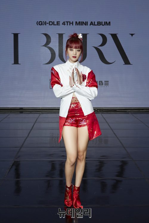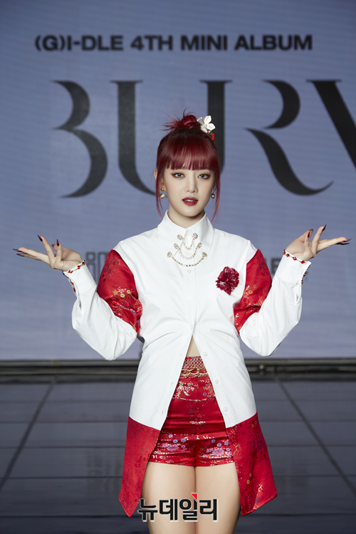 걸그룹 (여자)아이들 민니가 11일 오후 온라인으로 진행된 4번째 미니앨범 'I burn(아이 번)' 쇼케이스에서 포토타임을 갖고 있다.이번 앨범은 '이별은 완전히 잊혀질 때까지 끝난 것이 아니다'는 생각에서 시작됐다. 이별 후 행복을 되찾기 전까지의 과정 속에서 느껴지는 여러 가지 감정들을 담아냈다.타이틀 곡 '화(火花)'는 타오르는 불과 화려한 꽃을 메타포로 사랑의 아픔을 노래한 곡이다. 리더 소연과 작곡가 Pop Time이 공동으로 작업해 중독성 있는 훅과 극적인 감정 변화를 담은 노랫말이 인상적이다. (사진=큐브엔터테인먼트)