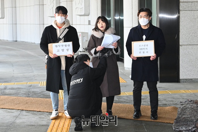 변호사시험 응시생들이 12일 오전 서울 서초구 대검찰청에서 '변호사시험 법전사태 관련 추미애 법무부장관 고발 기자회견'을 갖고 있다.