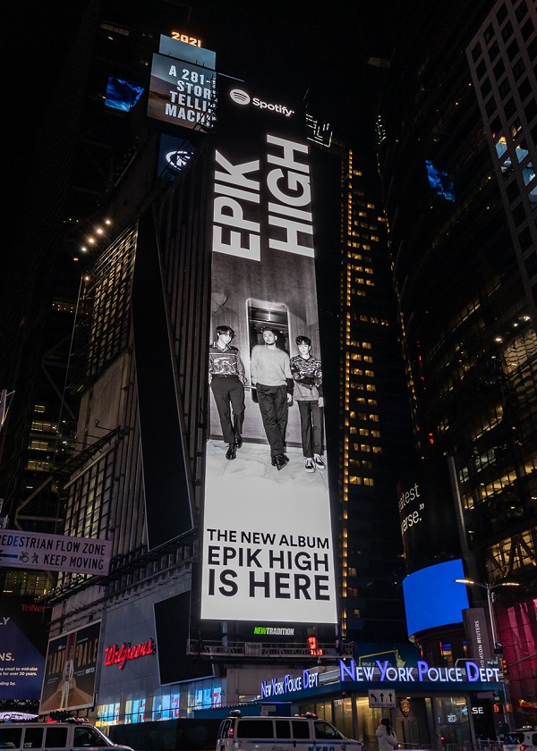 타임스퀘어에서도 가장 중심에 위치한 이른바 '메인 전광판'을 장식한 에픽하이의 광고는, 세계 최대 스트리밍 플랫폼 스포티파이(Spotify)가 에픽하이의 정규 10집 첫 번째 앨범(Epik High Is Here 上)을 '명반'으로 인정하며 선물로 건넨 것이라고.