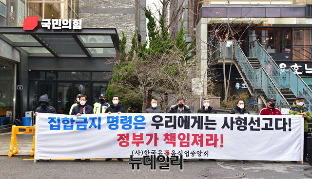 사단법인 한국유흥음식업중앙회 회원들이 26일 오후 서울 여의도 국민의힘 당사와 더불어민주당 당사앞에서 각각 기자회견을 열고 "정치권이 유흥업주들의 호소에 귀를 기울여 달라"며 "정부의 조치에 공정성이 결여됐음에도 방역당국과 정치권 누구도 우리의 말을 들으려 하지 않았다"고 했다.유흥주점은 지난해 3월 22일부터 15일간의 영업정지 제1차 명령을 시작으로 현재까지 약 10개월여 간 영업정지 상태다.이들은 같은시간 세종정부청사 앞에서 기자회견을 열고, 대화의 광장으로 나올것을 호소했다.