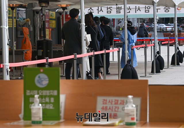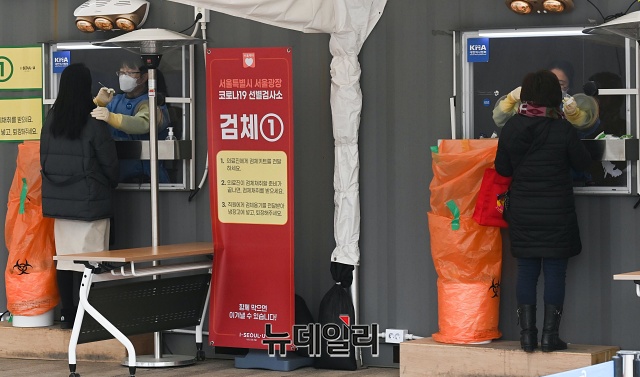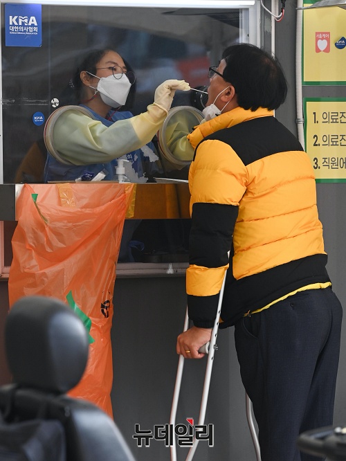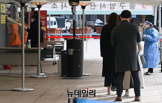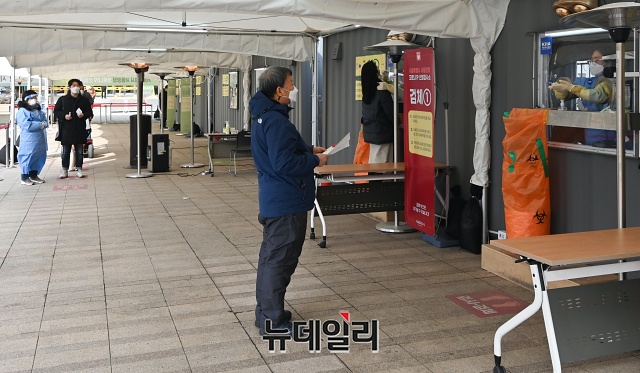 '코로나19(중국 우한 폐렴)' 신규 확진자가 559명 발생한 27일 오후 서울 중구 서울광장에 마련된 임시선별검사소를 찾은 시민이 검사를 받고 있다. 신규 확진자는 열흘 만에 500명 대를 기록했다.