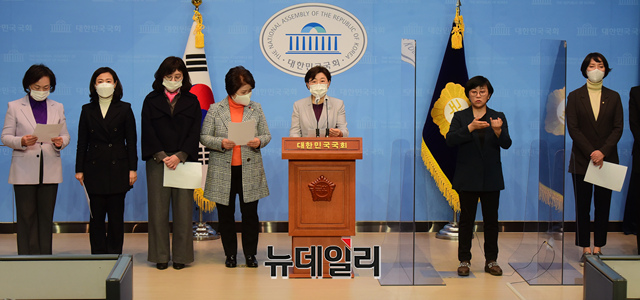 김정재 국민의힘 성폭력대책특위원장 및 당 소속 의원들이 27일 오후 국회 소통관에서 박원순 전 서울시장 인권위 조사결과 관련 기자회견을 갖고 있다.