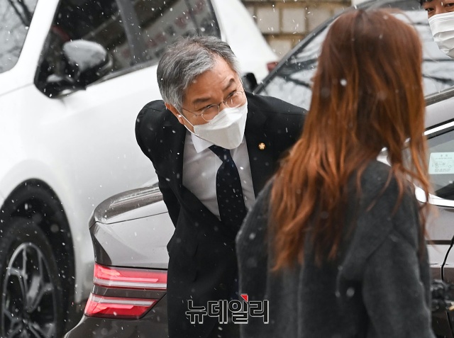 최강욱 열린민주당 대표가 28일 오후 서울 서초구 서울중앙지법에서 열린 1심 선고공판에 출석하고 있다. 최 대표는 변호사 시절 조국 전 법무부 장관 아들에게 로펌 인턴증명서를 허위 발급한 혐의를 받고 있다.