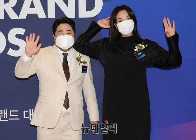 코미디언 부부 강재준, 이은형이 28일 오후 온라인으로 진행된 '2021 대한민국 퍼스트 브랜드 대상'에 참석해 포토타임을 갖고 있다. (사진=한국소비자포럼)