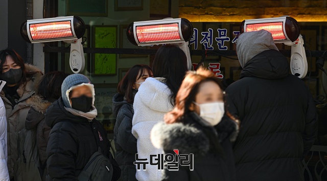 전국적으로 강풍 특보가 발효된 29일 오후 서울 종로구 광화문역 인근 식당에서 손님들이 난로를 쐬며 기다리고 있다.