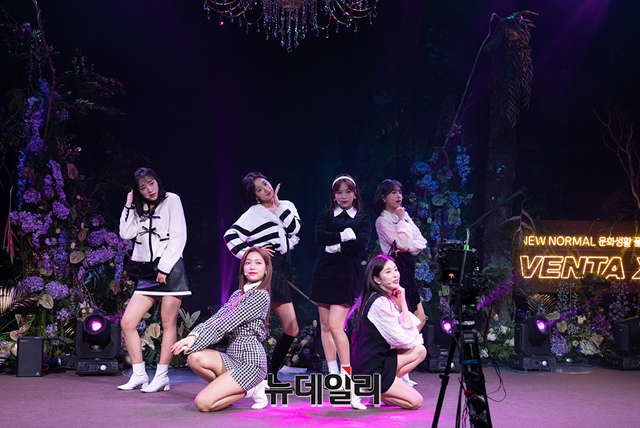 걸그룹 에이프릴(윤채경, 김채원, 이나은, 양예나, 레이첼, 이진솔)이 29일 비대면으로 진행된 VR 콘서트 '2021 VENTA X VR/XR CONCERT'에 참석해 포토타임을 갖고 있다.