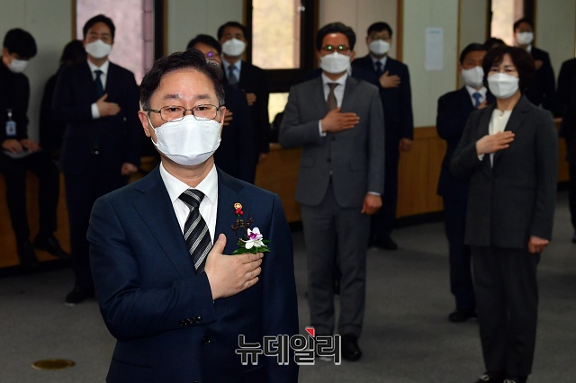 박범계 신임 법무부장관이 1일 오전 경기 과천시 정부과천청사에서 열린 장관 취임식에 입장하고 있다.