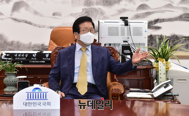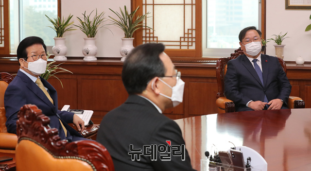 박병석 국회의장이 1일 오전 국회 의장실에서 김태년 더불어민주당 원내대표, 주호영 국민의힘 원내대표와 회동을 갖고 주요 의사일정 및 법안 처리와 관련 의견을 나누고 있다. (사진=공동취재단)