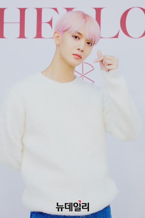 아이돌그룹 CIX(씨아이엑스)의 멤버 배진영이 2일 오후 온라인으로 진행된 4번째 앨범 '안녕 낯선 꿈' 발매 기념 기자간담회에서 포토타임을 갖고 있다.