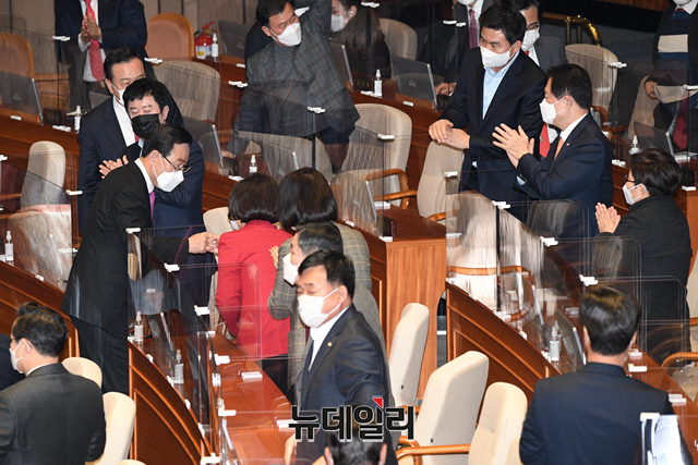 [포토] 교섭단체 대표연설 마치고 내려오는 주호영 원내대표