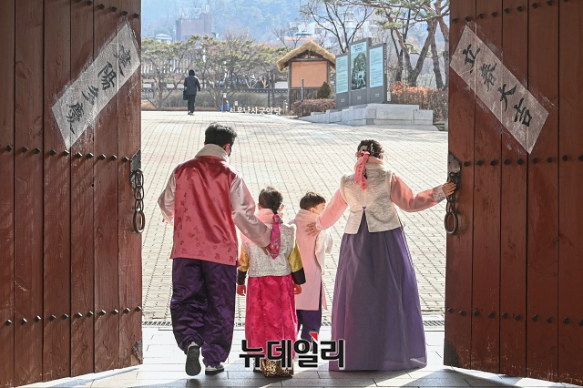 절기상 봄의 시작을 알리는 입춘(立春)인 3일 오후 서울 중구 남산골한옥마을에서 김지호 어린이 가족들이 입춘첩을 붙이고 문을 열고 있다.
